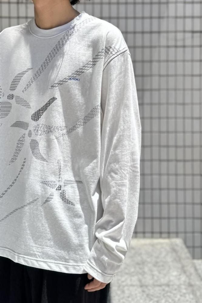 オリジナルのグラフィックをプリントした長袖Tシャツ。