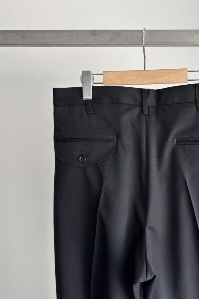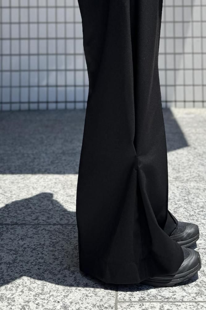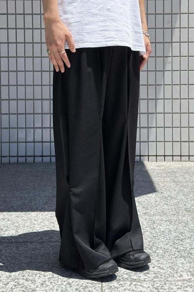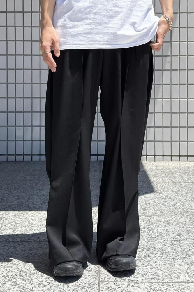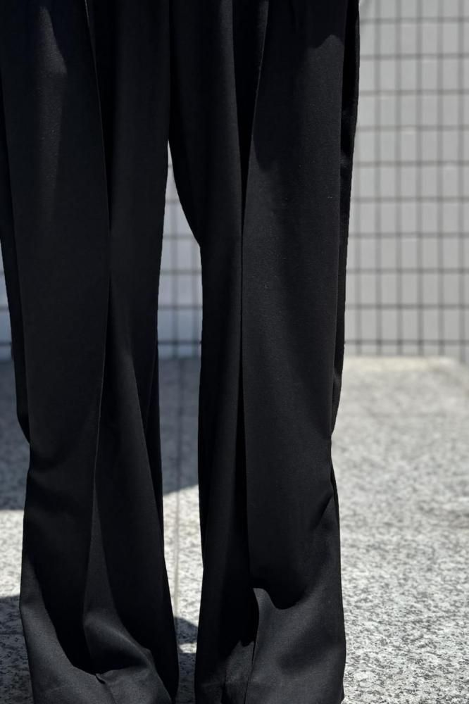 上品な生地とユニークなフォルムのバランスが心地良いパンツです。