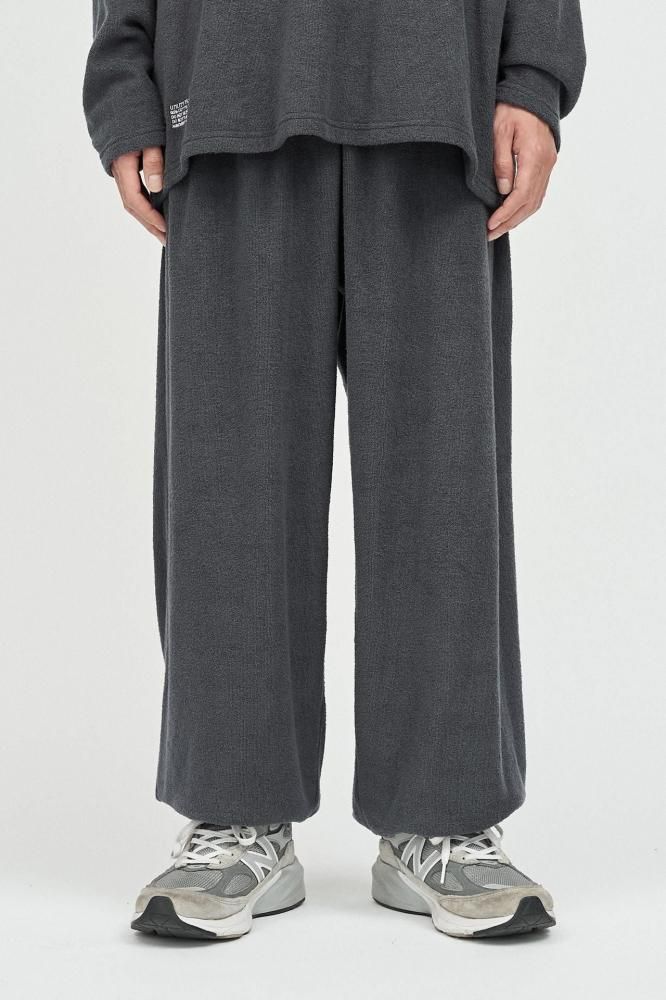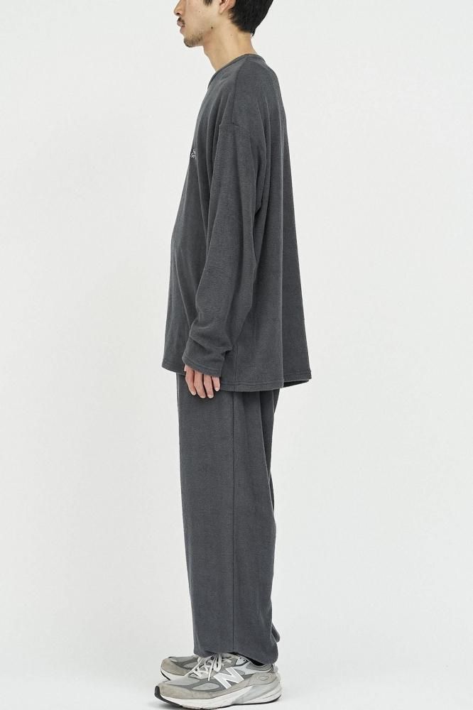 トップスはシンプルな長袖クルーネック型、パンツはウエストと裾にドローコードを搭載したイージーパンツ型のデザイン。