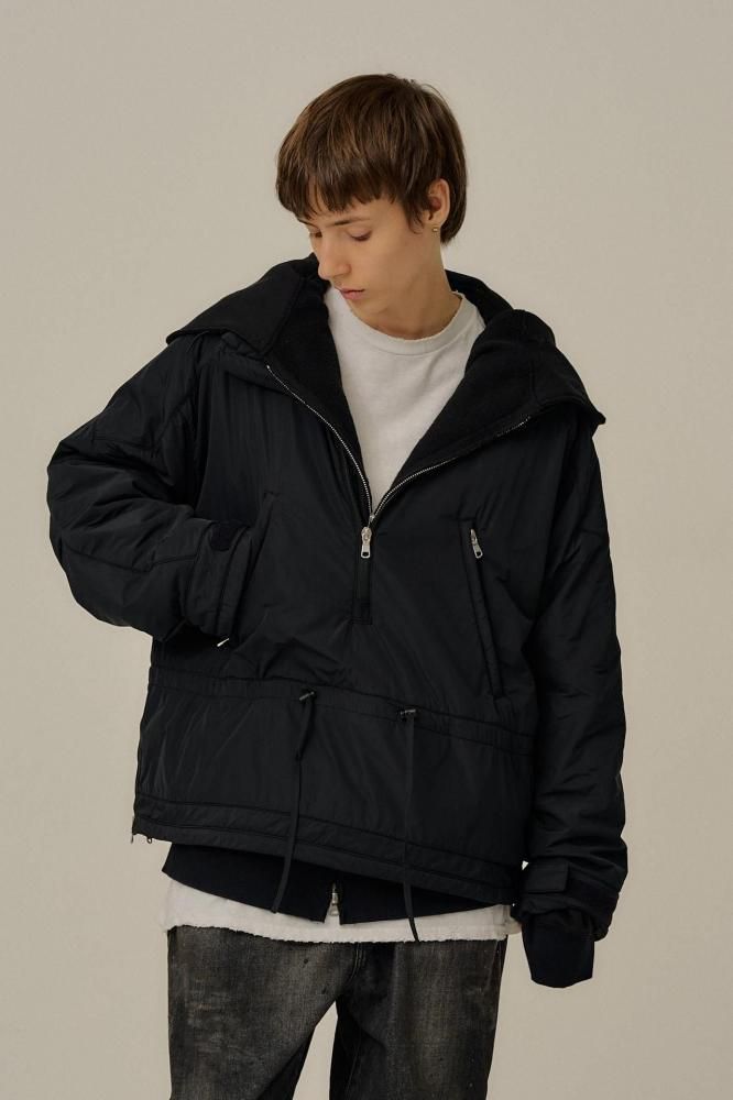 旧いアウトドアウェアから着想しつつ、深めのフロントジップを配したデザイン。