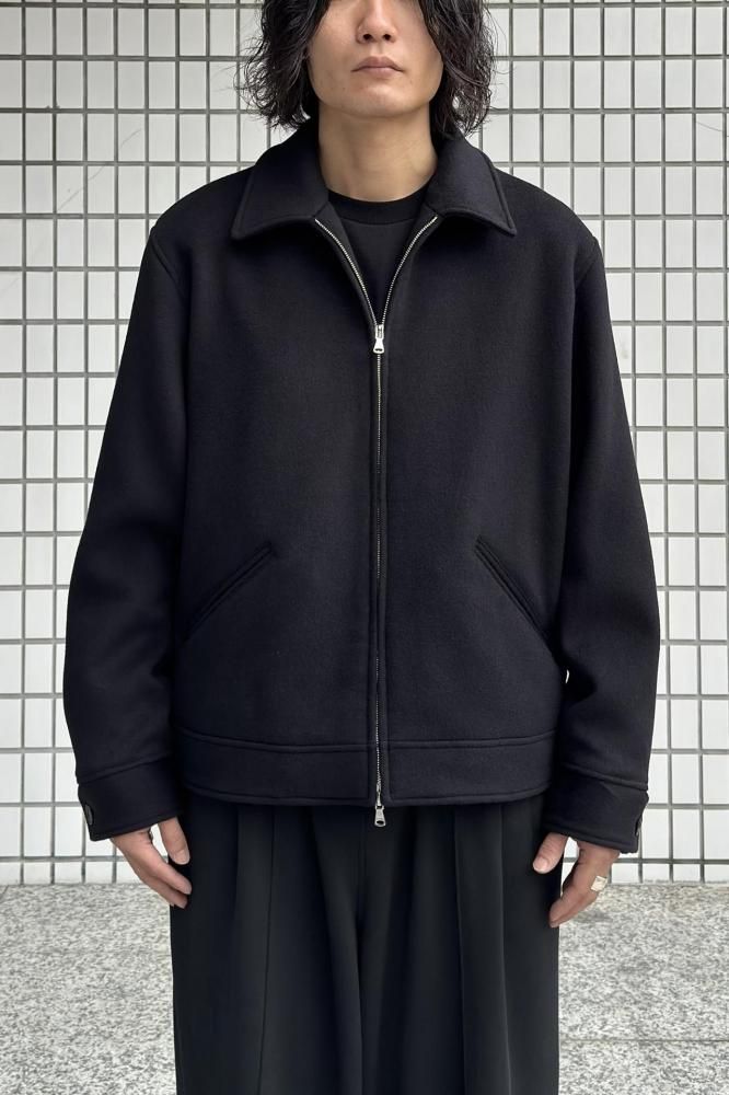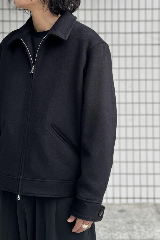 ミニマルな印象ながら鏡面仕上げのジッパーをアクセントにしており、両玉縁ポケットやカフス仕様の袖口など、洗練されたディテールも特徴です。